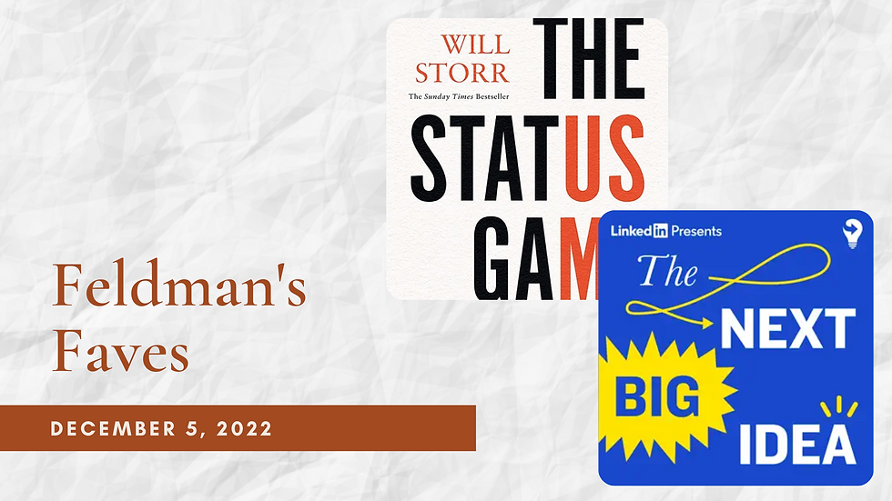 The Next Big Idea - Status: Does Our Need for It Explain ... Everything? – For those of you who are interested in this book but don’t have the time or interest to actually read it, this interview lays out the basic premise of Storr’s book and philosophy in about an hour. Here’s an excerpt from the PODCAST itself: “Life is a game. There’s no way to understand the human world without first understanding this. Everyone alive is playing a game whose hidden rules are built into us and that silently directs our thoughts, beliefs and actions. This game is inside us. It is us. We can’t help but play.” So begins “The Status Game,” a new book by acclaimed writer Will Storr. He continues: “We play for status, if only subtly, with every social interaction, every contribution we make to work, love or family life and every internet post. We play with how we dress, how we speak and what we believe. … Life is not a journey towards a perfect destination. It’s a game that never ends. And it’s the very worst of us.” Does it have to be? We may not be able to quit the status game, but Will says we can learn to play it better. In this episode, he explains how”: https://podcasts.apple.com/ca/podcast/the-next-big-idea/id1482067226?i=1000584905408