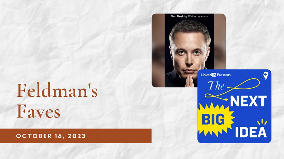 THE NEXT BIG IDEA – ELON MUSK: Walter Isaacson on the World’s Most Polarizing Person – For those of you who don’t have the time or interest to read the book, this interview with Walter Issacson is a pretty good summary. Here is an excerpt from the PODCAST itself, “Two years ago, Walter Isaacson, the legendary biographer who has written books about Steve Jobs, Albert Einstein, Benjamin Franklin, and Leonardo da Vinci, began shadowing Elon Musk. "I started off with a guy who was one of the most popular people on the planet," Isaacson says, "and ended up with a guy who's the most controversial." Today on the show, Isaacson unpacks those controversies.” https://podcasts.apple.com/ca/podcast/the-next-big-idea/id1482067226?i=1000627843131